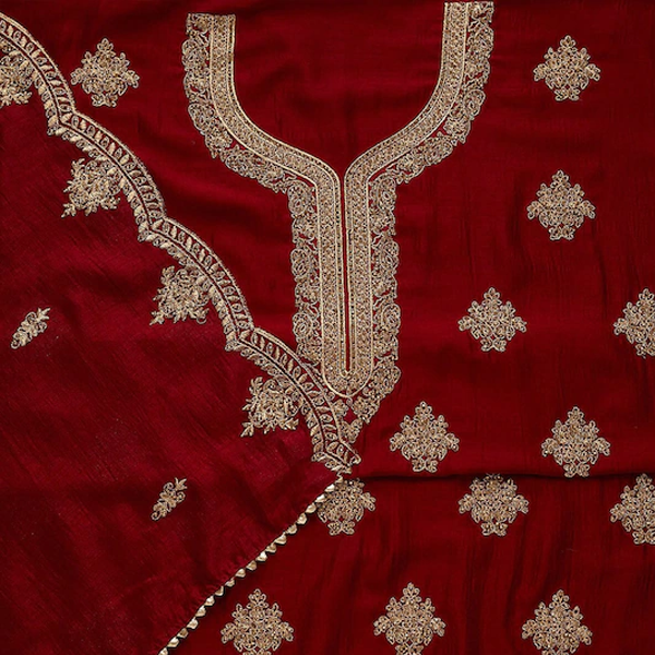 Maroon & Gold-Toned Embroidered Art Silk Unstitched Dress Material