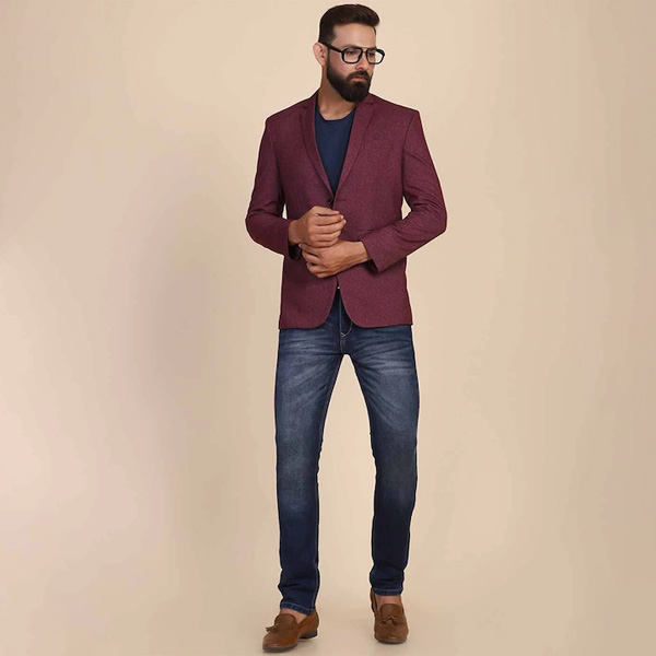 Maroom solid slim-fit blazer, has a notched lapel collar, full sleeves ,single-breasted with twod button closure, and two flap-pocket.
