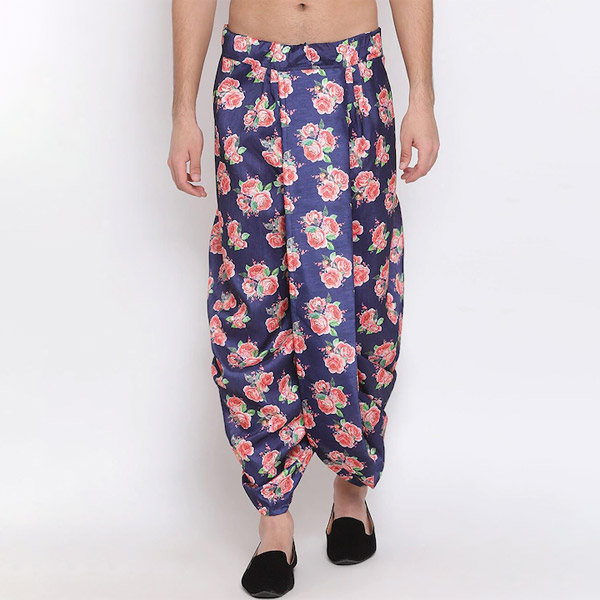 - Navy blue dhoti pants with intricate embroidery detailing, has an elasticated waistband with slip-on closure